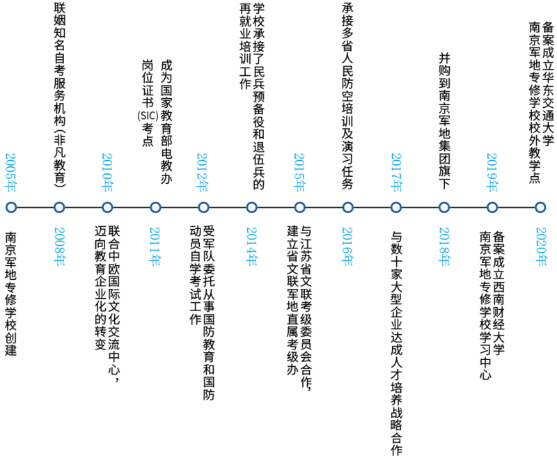 南京军地专修学校于2005年6月经南京市雨花台区教育局批准成立。学校以“质量立校、特色兴校”为办学理念,以“为区域经济建设和社会发展服务”为办学定位,专注于继续教育、国防教育和党建理论教育,努力打造具有军地特色行业领先的专修学校。目前已培养学员数万名,为城市经济建设和社会发展作出了贡献。